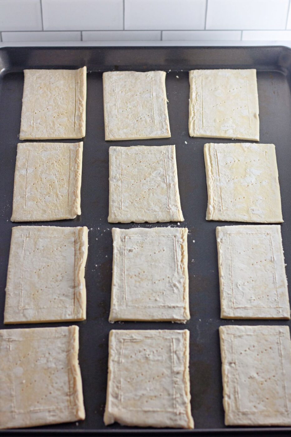 - Lay puff pastry sheets flat; cut into 12 rectangles. Score a ½-inch border on each and prick centers with a fork.
