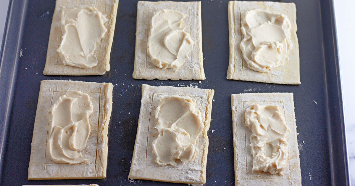 Step 1: Preheat oven to 400F. Lay out the puff pastry sheets and cut into 12 rectangles. Take out cream cheese to come to room temperature.