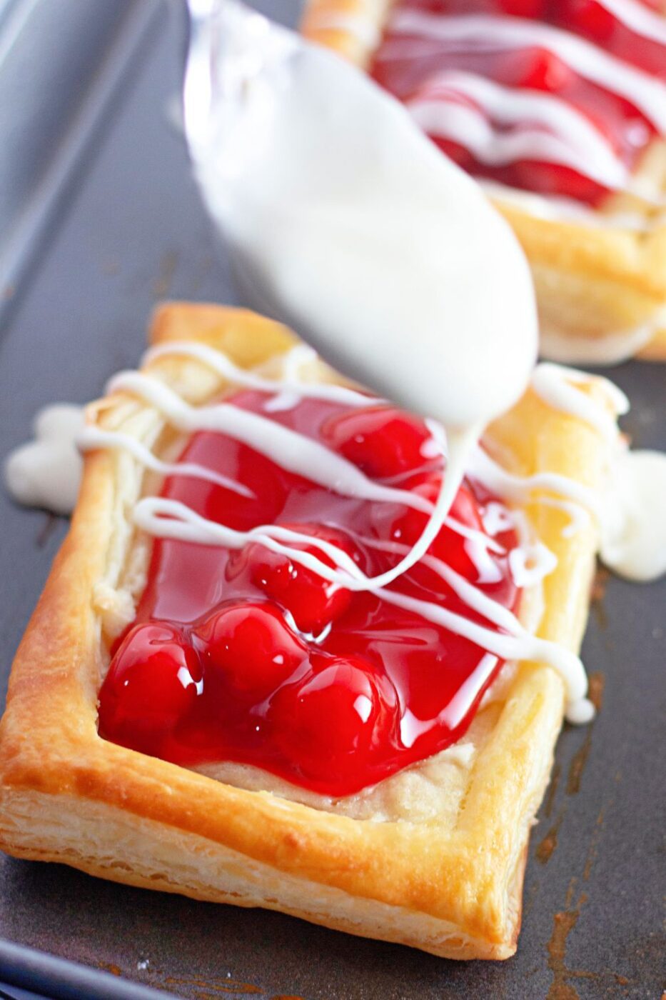 These cherry danishes deliver everything you want from a pastry: buttery layers that shatter at first bite, a creamy base that melts into the crumb, and bright fruit that anchors the richness. They are versatile enough for brunch, dessert, or even a holiday platter, and with store-bought puff pastry, they come together quickly. The glossy fruit and drizzle of icing make them look as though they came from a bakery case, but the reward here is baking them at home — your kitchen will smell like butter and sugar as they emerge, ready to eat. (Better to wait til they cool a bit before that first bite.)