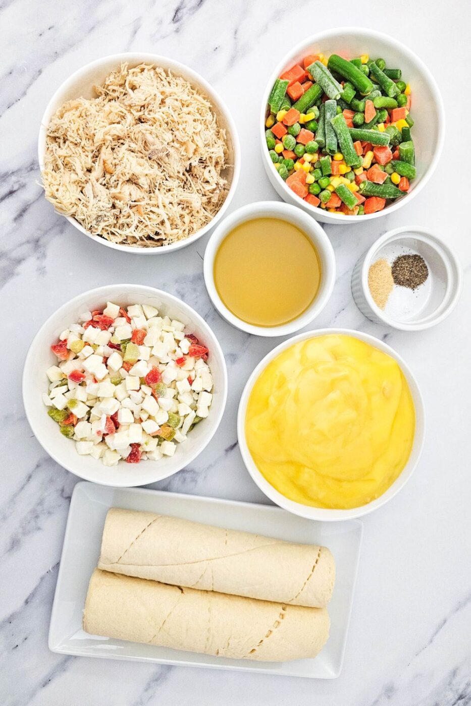As the casserole bakes, the crescent rolls rise and turn golden, sealing in a filling that is both creamy and hearty. The chicken softens further in the oven, absorbing the flavor of broth and cream of chicken soup, while the mixed vegetables and potatoes hold just enough bite to balance the sauce.
