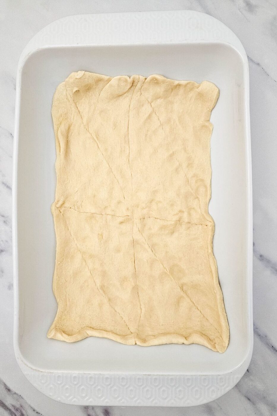 - Unroll one tube of crescent rolls, press seams together, and lay flat in the dish. Bake 15 minutes.