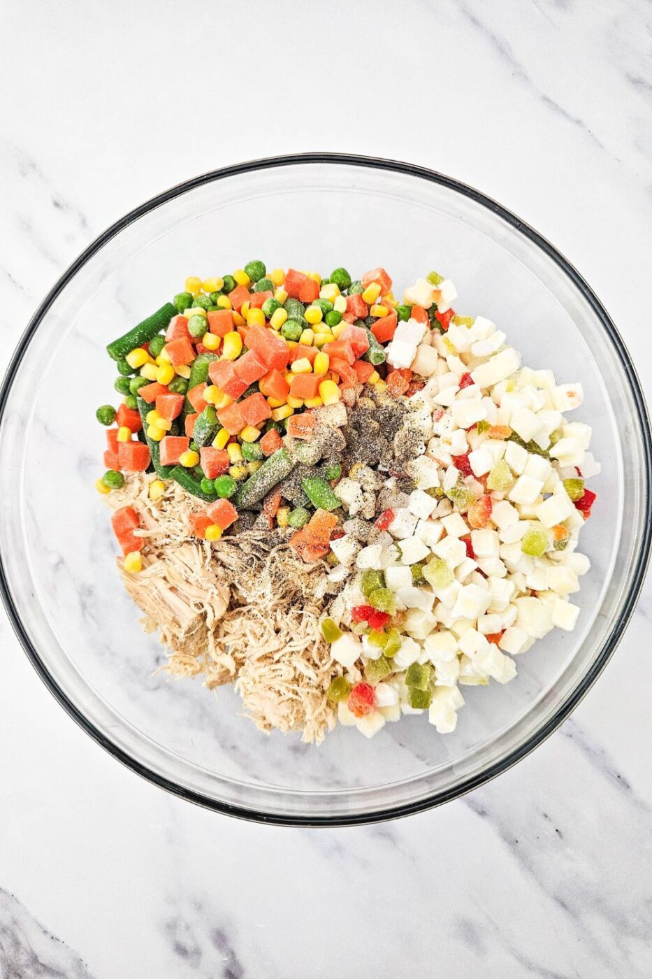 Step 3: In a large bowl, toss together the shredded chicken, vegetables, Hash Browns O’Brien
