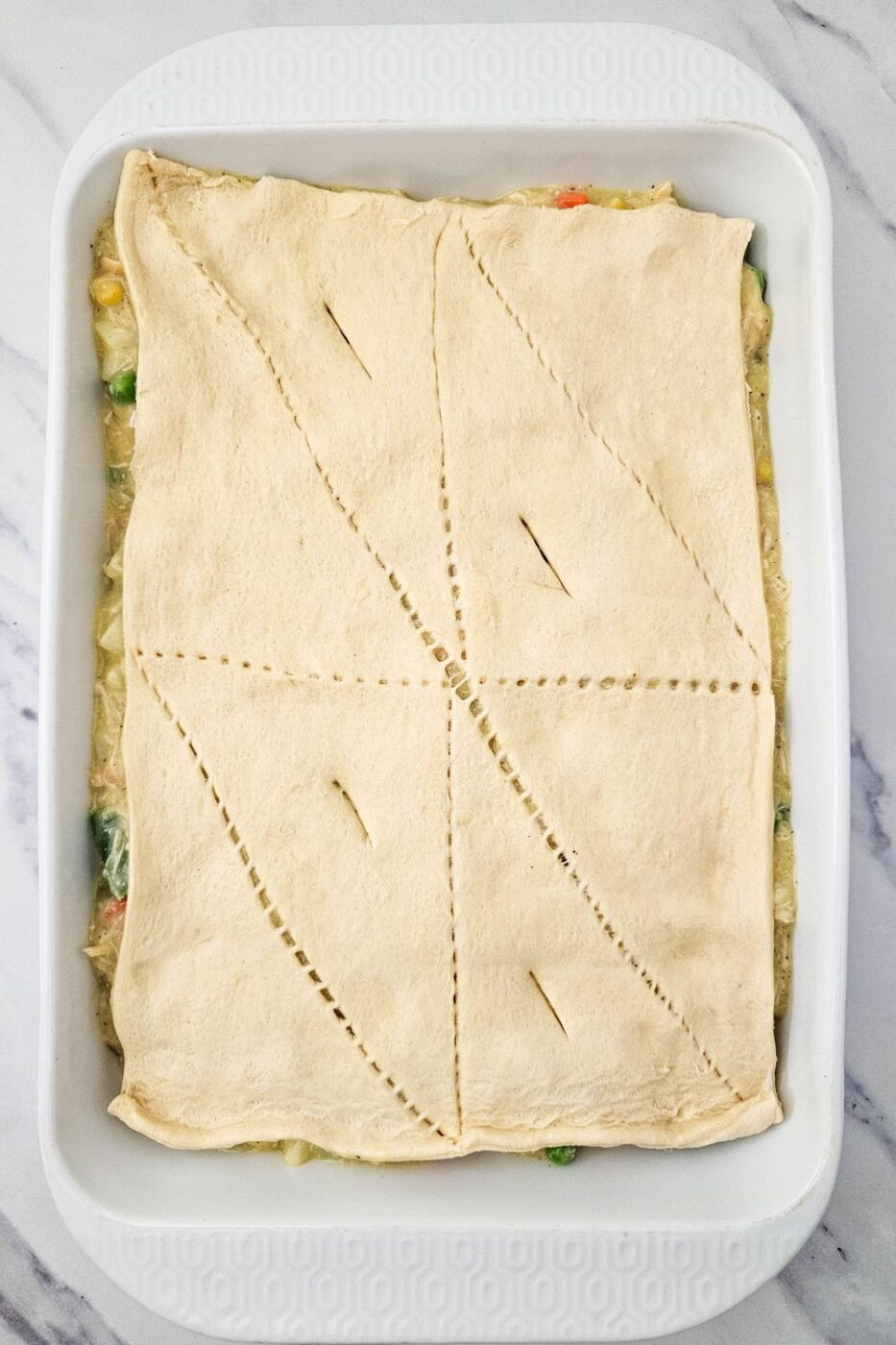 Step 6: Unroll the second tube of crescent rolls and lay on top, pinching seams together. Cut 4 small slits in the top crust.