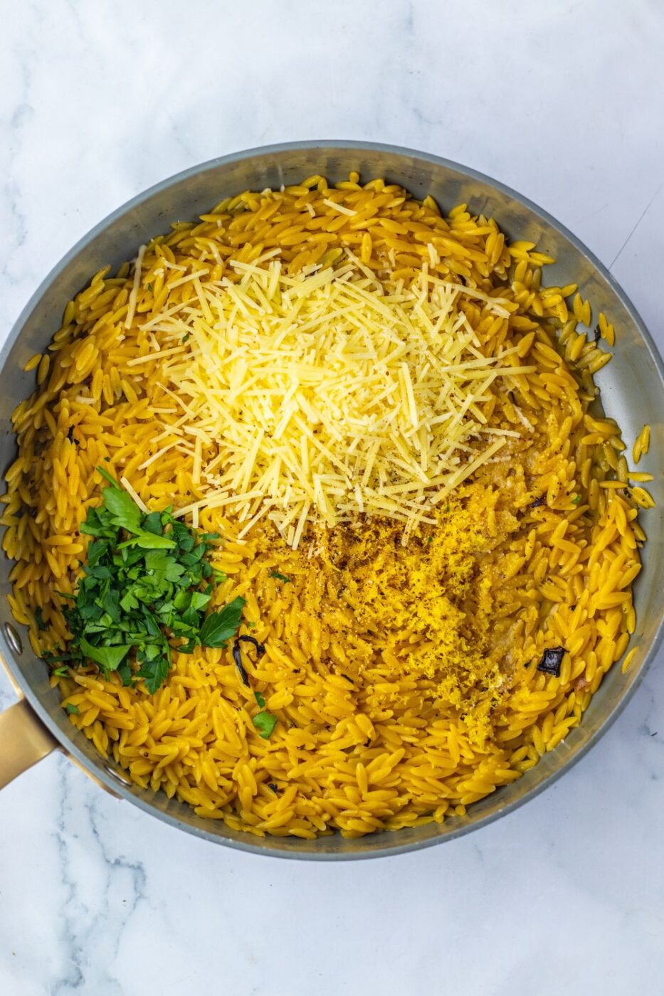 Step 4: Remove meatballs and set aside. In the same pan, add orzo and chicken broth. Boil, turn to low and simmer 8–10 minutes. Stir in lemon juice, zest, parsley, Parmesan, salt, and pepper until cheese melts into the pasta.