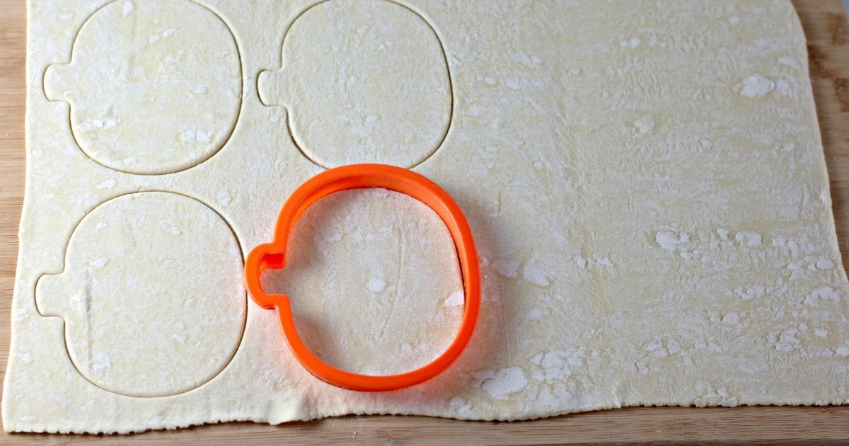 Step 2: Roll out each sheet of thawed puff pastry to about 8 x 14 inches using a rolling pin. Use a pumpkin-shaped cookie cutter to cut out pumpkin shapes.