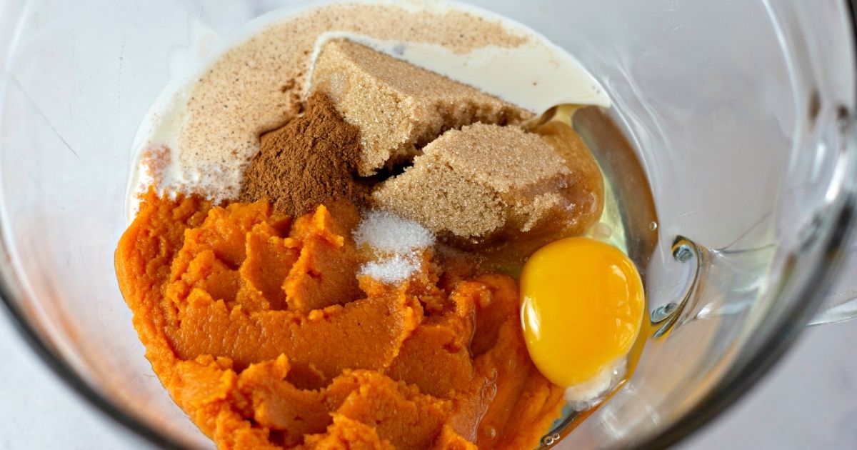 - In a bowl, mix pumpkin puree, brown sugar, 1 egg, cream, 1 t pumpkin pie spice, vanilla, and salt.