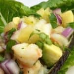- Prepare the stuffing – In a large, non-reactive bowl, gently combine the avocado flesh, pineapple slices, cilantro, and onion. Remove the chilled shrimp from the fridge and chop them in regular, bite-sized pieces. Fold the shrimp into the avocado-pineapple mixture. Pour 1 tablespoon of fresh pineapple juice, and season with salt and pepper.Using a large, wide spoon, scoop the shrimp-avocado mixture inside the reserved avocado shells as shown in the image above.