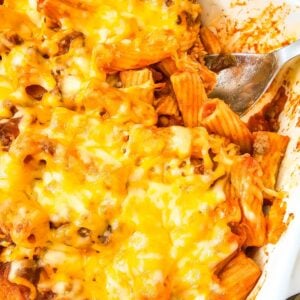 The familiar scent of sloppy joe sauce bubbling with ground beef fills the kitchen, rich and tangy from tomato and spice. As it bakes, the cheese melts into the rigatoni, catching bits of sauce in each curve of pasta.