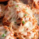 The spaghetti absorbs the sauce while baking, holding its shape as the cheese melts into every strand. Serve these hot from the oven with extra sauce on the side — a fork is optional.
