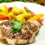 - Plate the pork chops. Pour the glaze over the chops and serve the peppers and pineapple alongside.