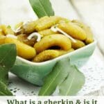 Gherkin, pronounced with a soft “g” and er-kin, not “jerkin. It is often called a baby cucumber, mini cucumber, cornichon, or cocktail pickle.