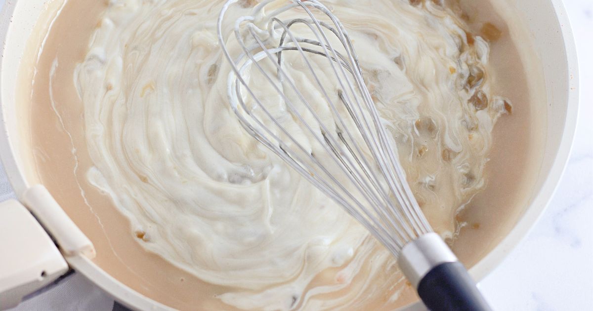 Step 6: Remove from heat and let cool slightly. Whisk in the sour cream and diced green chiles.